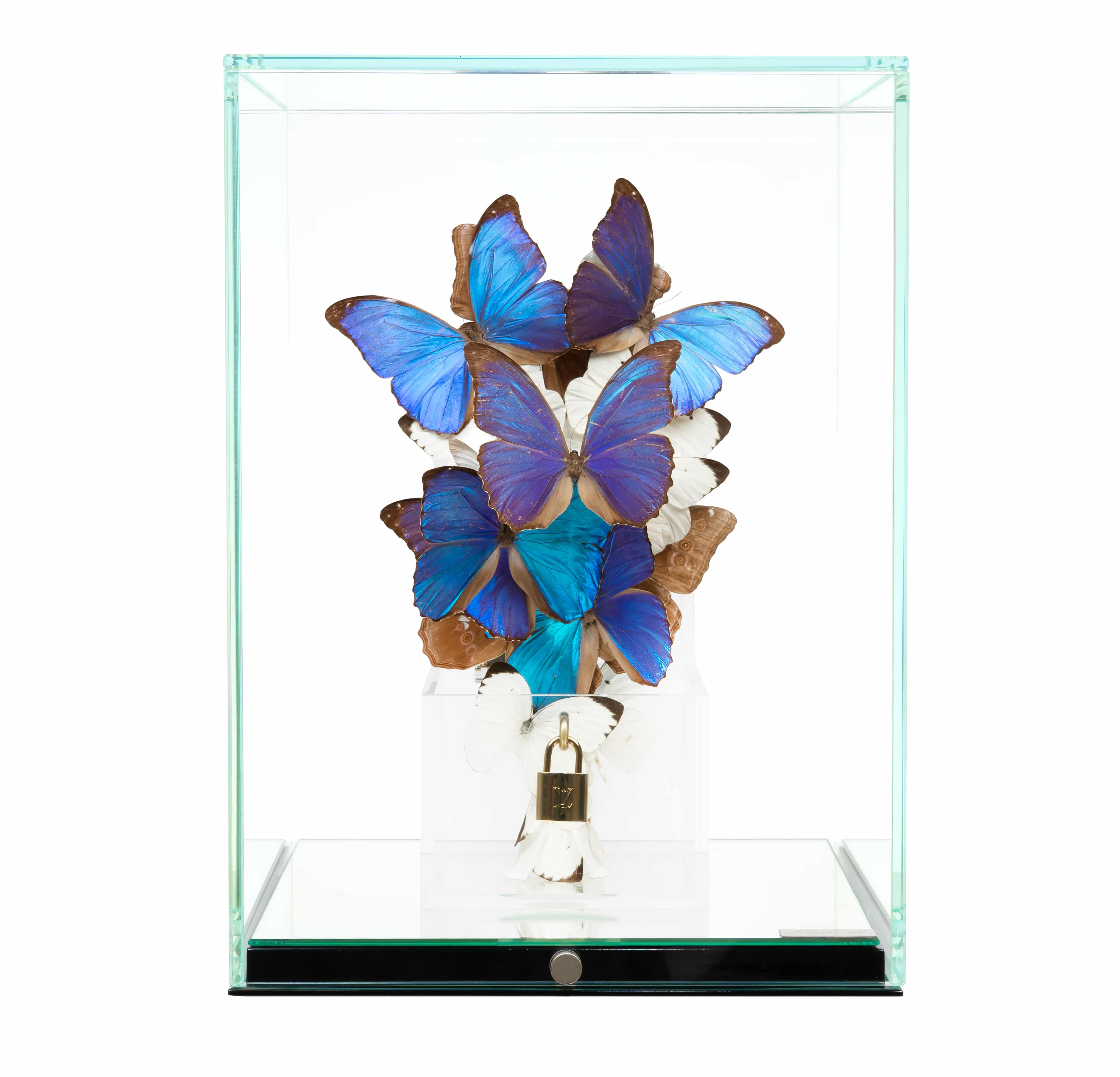 Roman Feral’s work explores the dialogue between organic beauty and modern cultural icons. His sculptures often feature natural butterflies preserved with precision, combined with glass, mirror, resin, and timeless objects. The result is an elegant and poetic aesthetic that reflects themes of transformation, memory, and the passing of time.