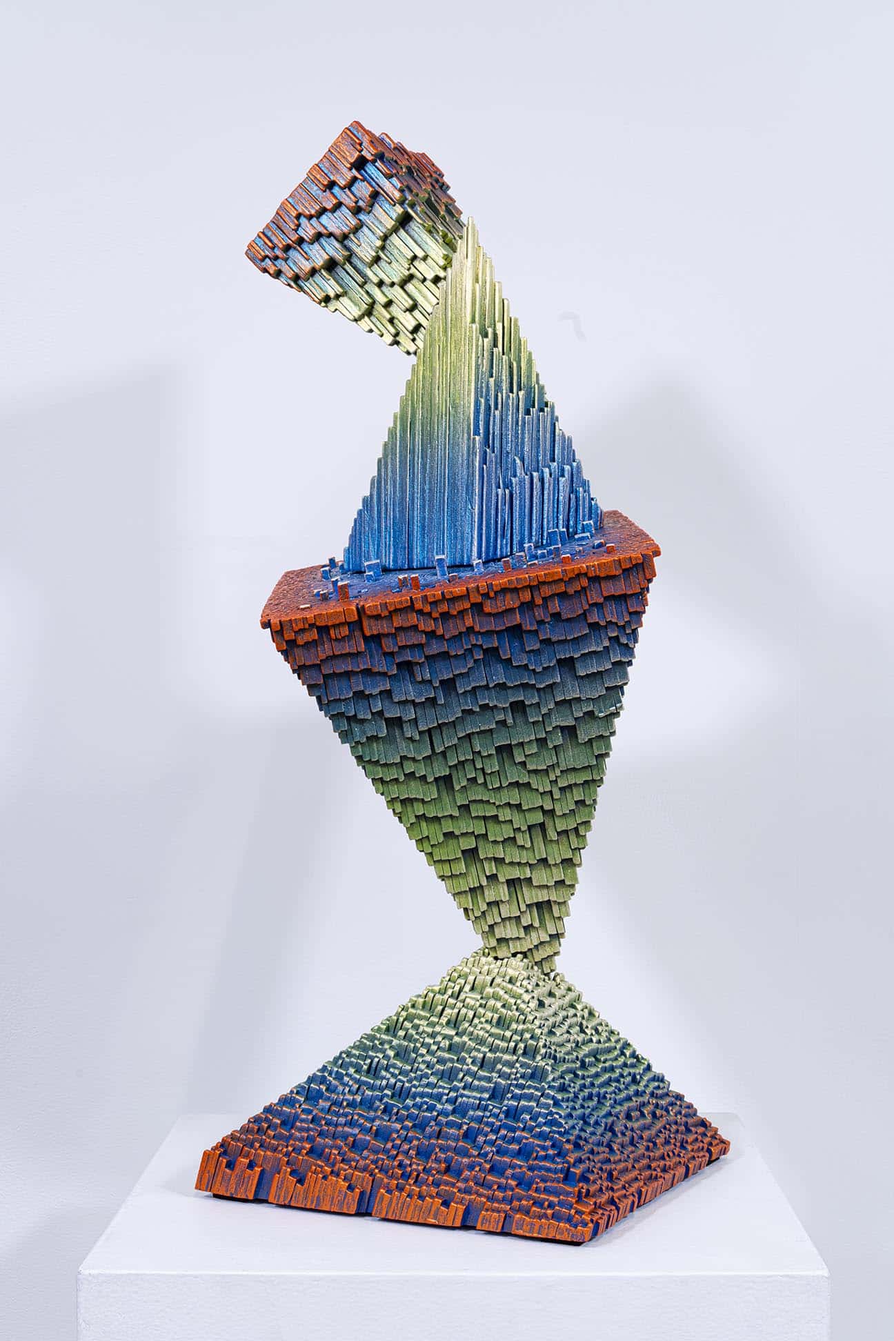 Discover Gil Bruvel‘s Cubic series, wooden sculptures blending architectural design and chromatic variation, showcased at OA Fine Art Galleries.
