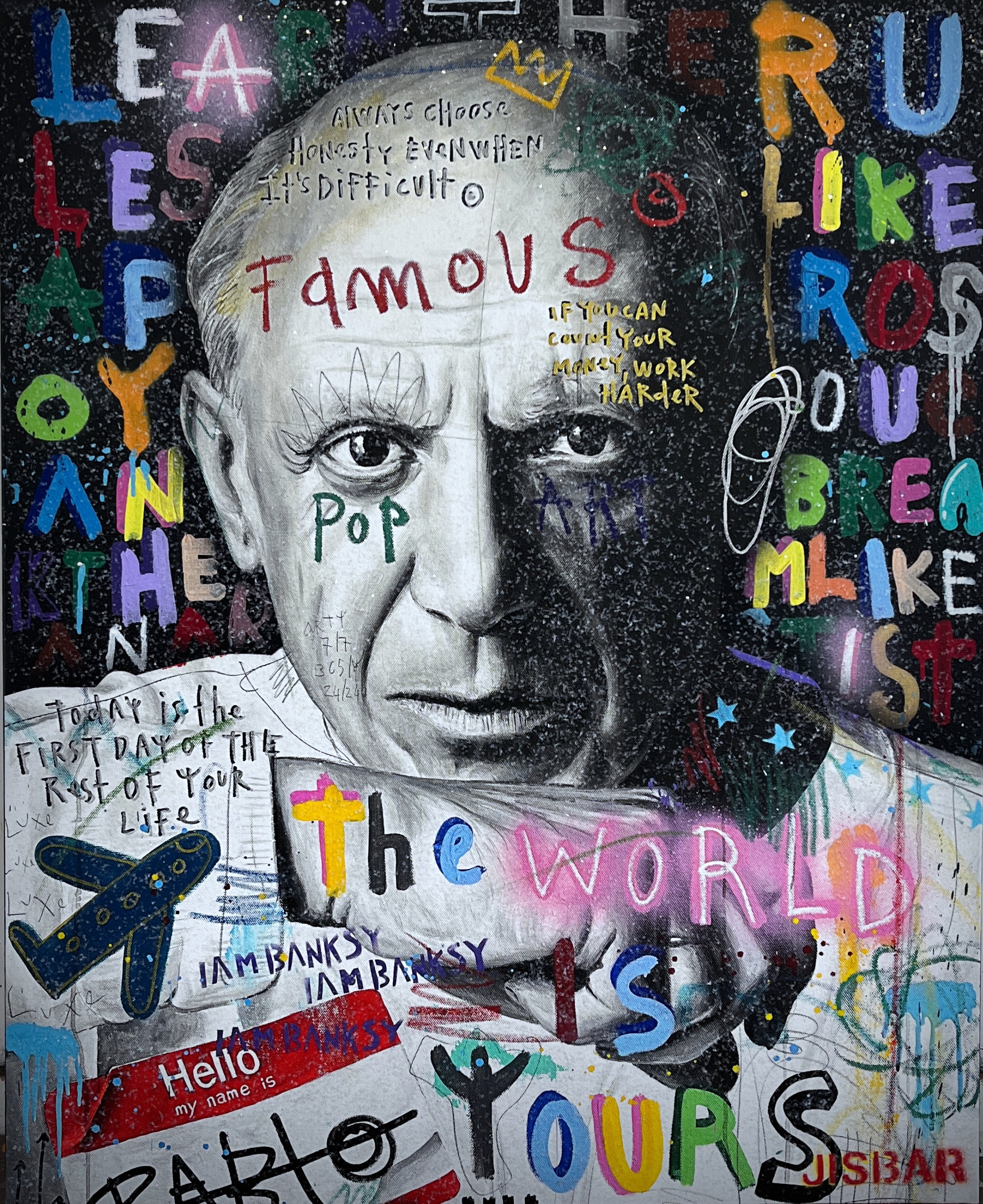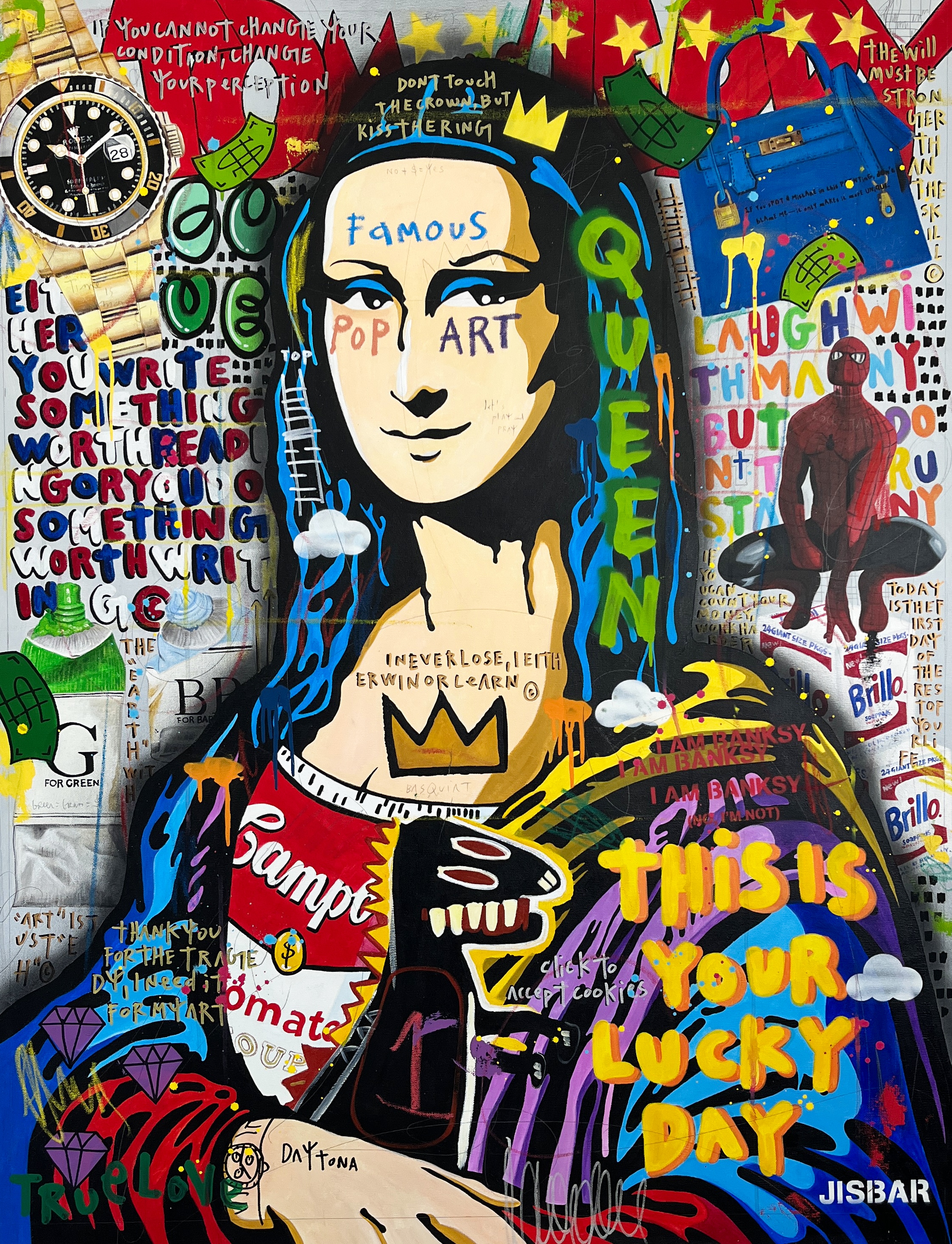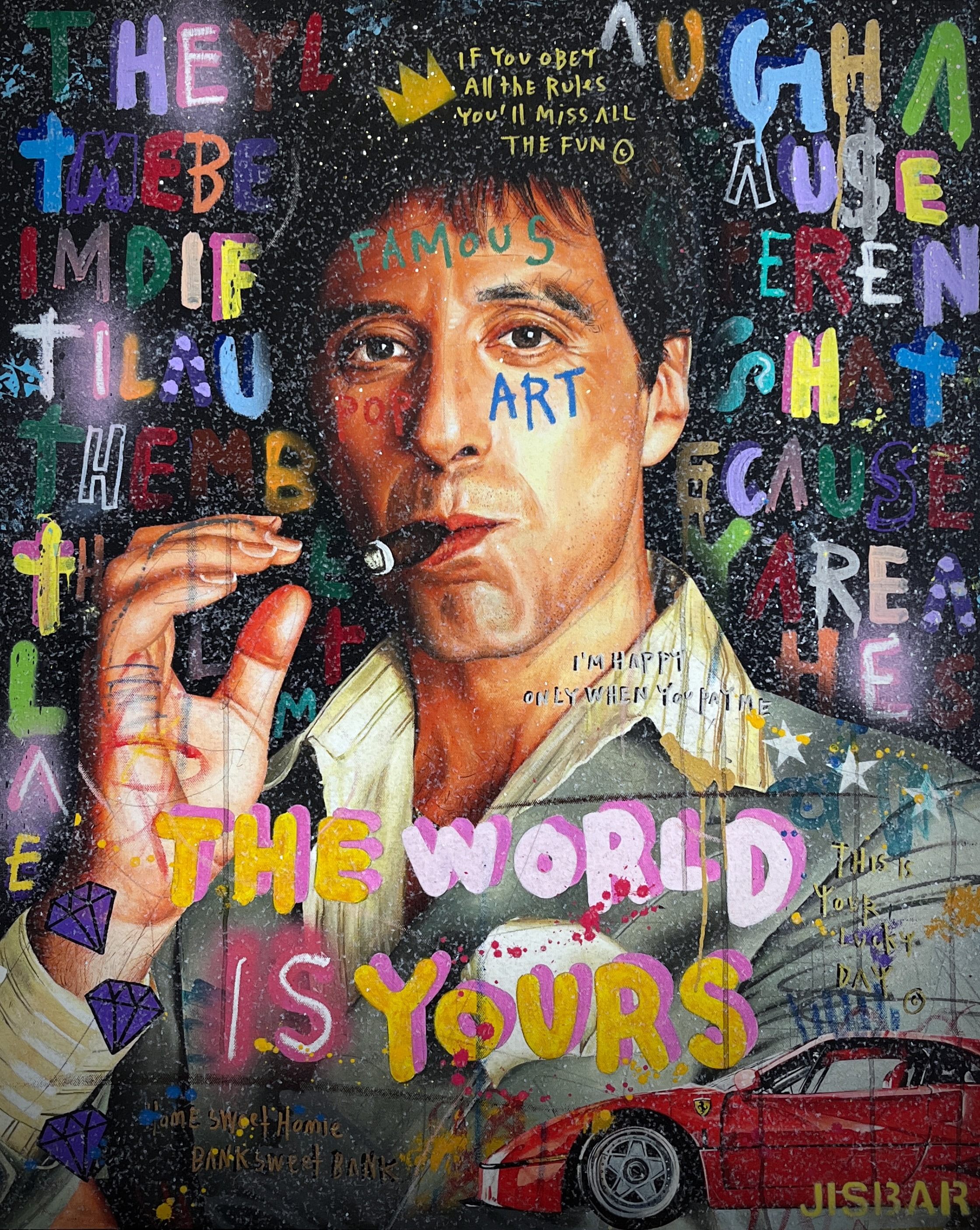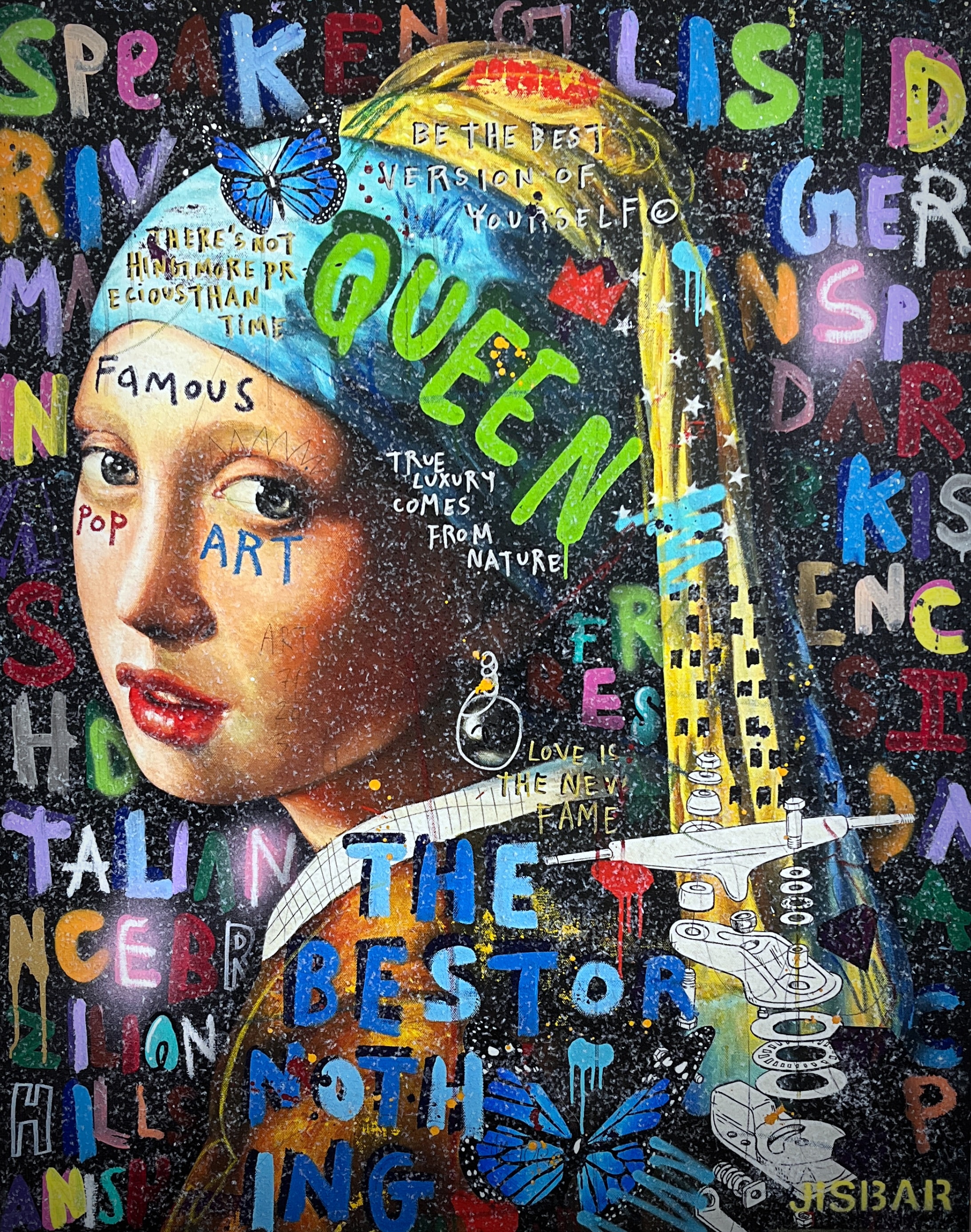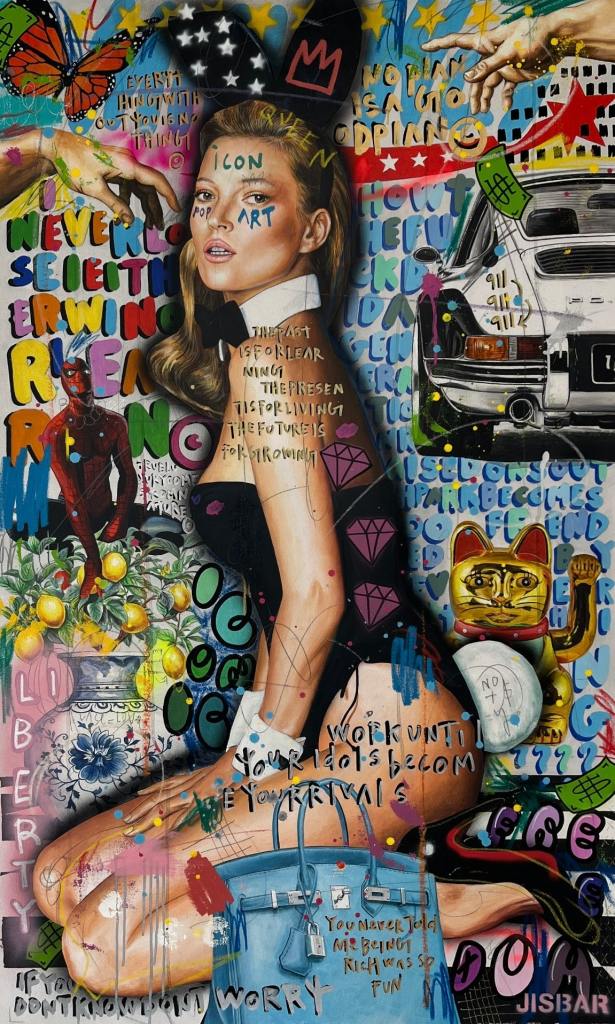 Jisbar se distingue par son interprétation moderne des chefs-d’œuvre classiques, qu’il réinvente avec des éléments graphiques, du collage et des références à la culture pop. Ses œuvres, mélangeant peinture, graffiti et typographie, offrent une vision décalée et dynamique de figures emblématiques telles que Mona Lisa, Frida Kahlo ou encore Van Gogh.