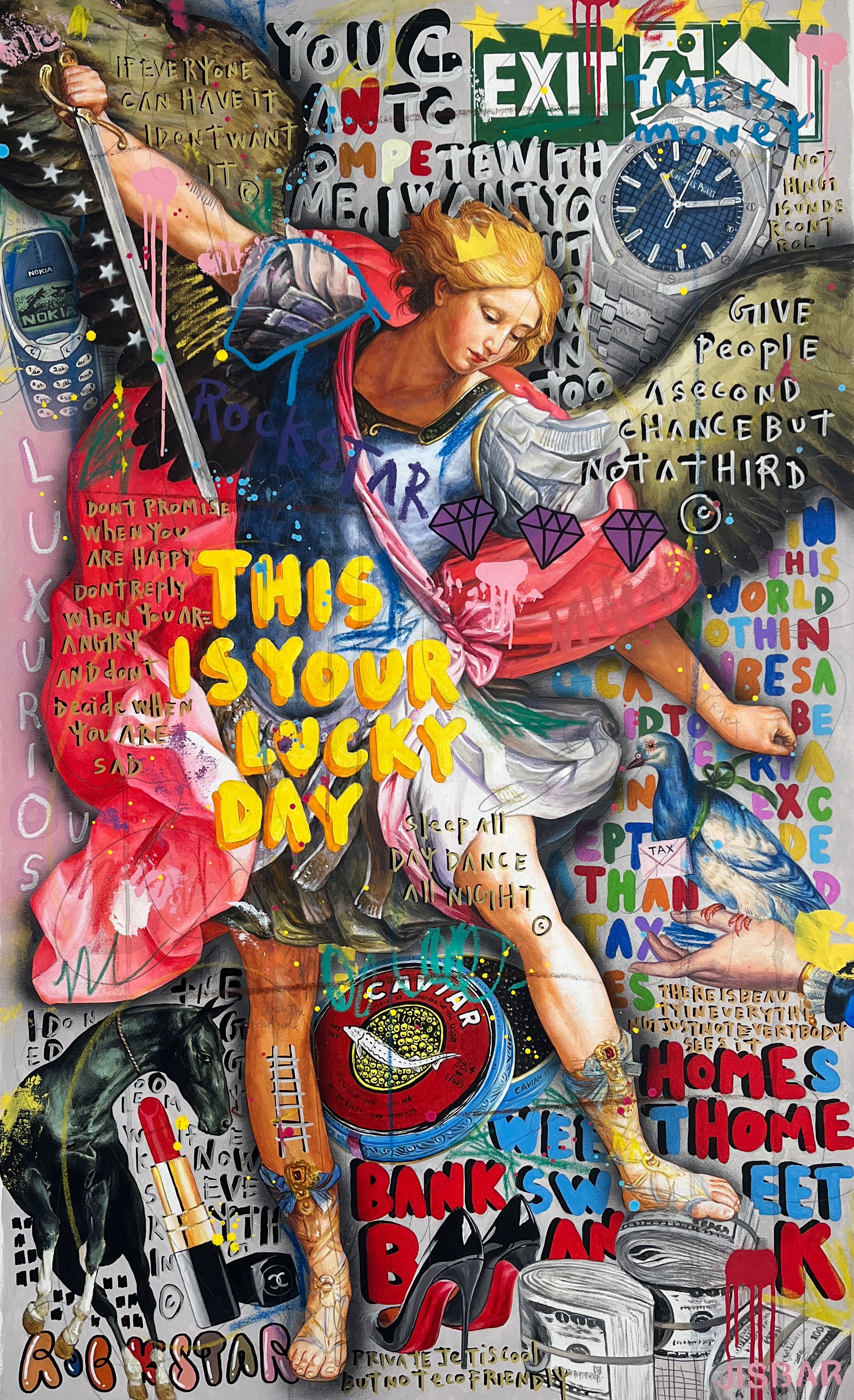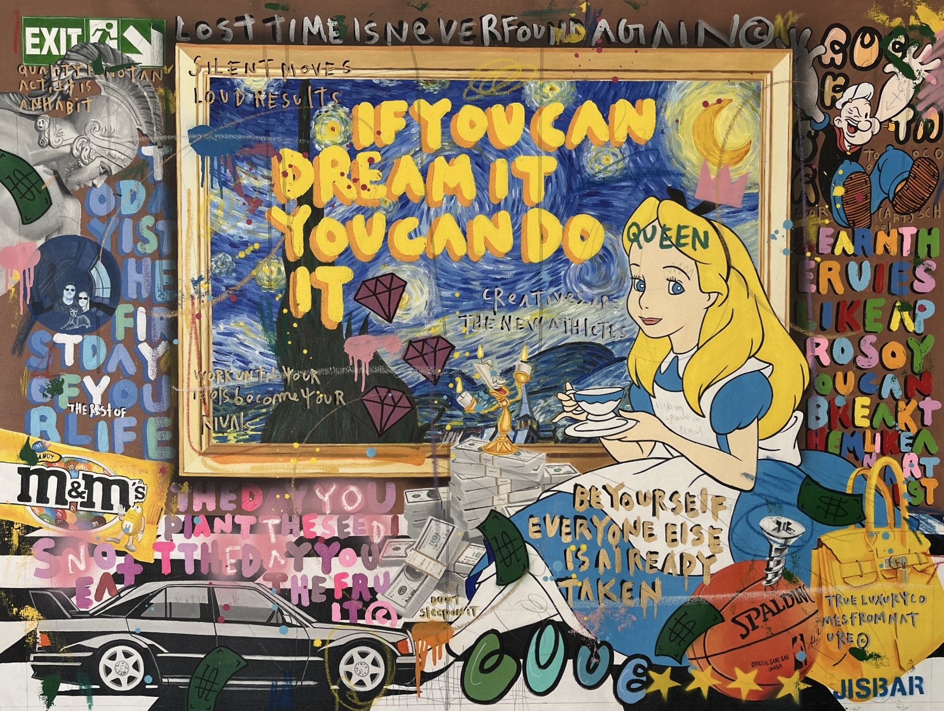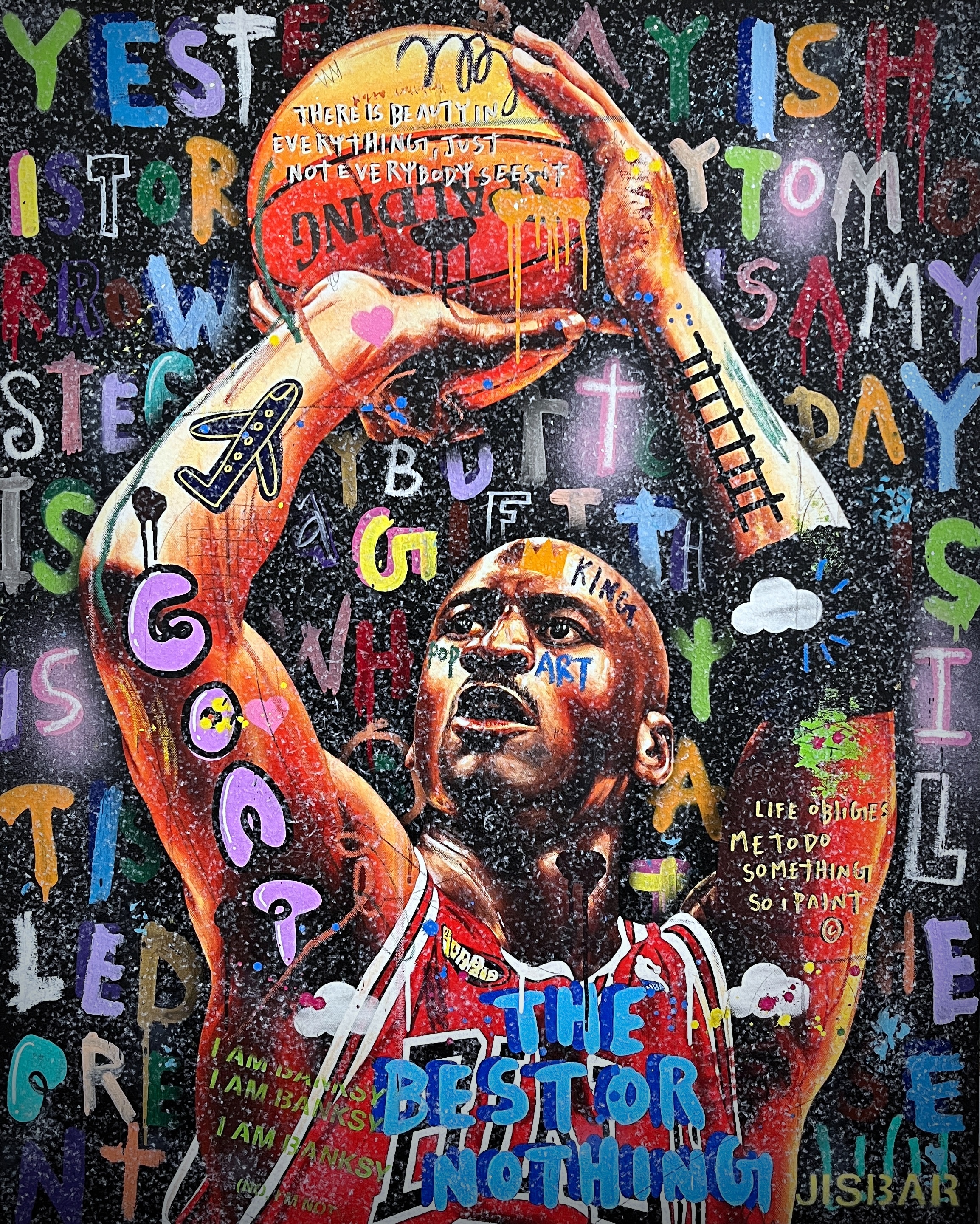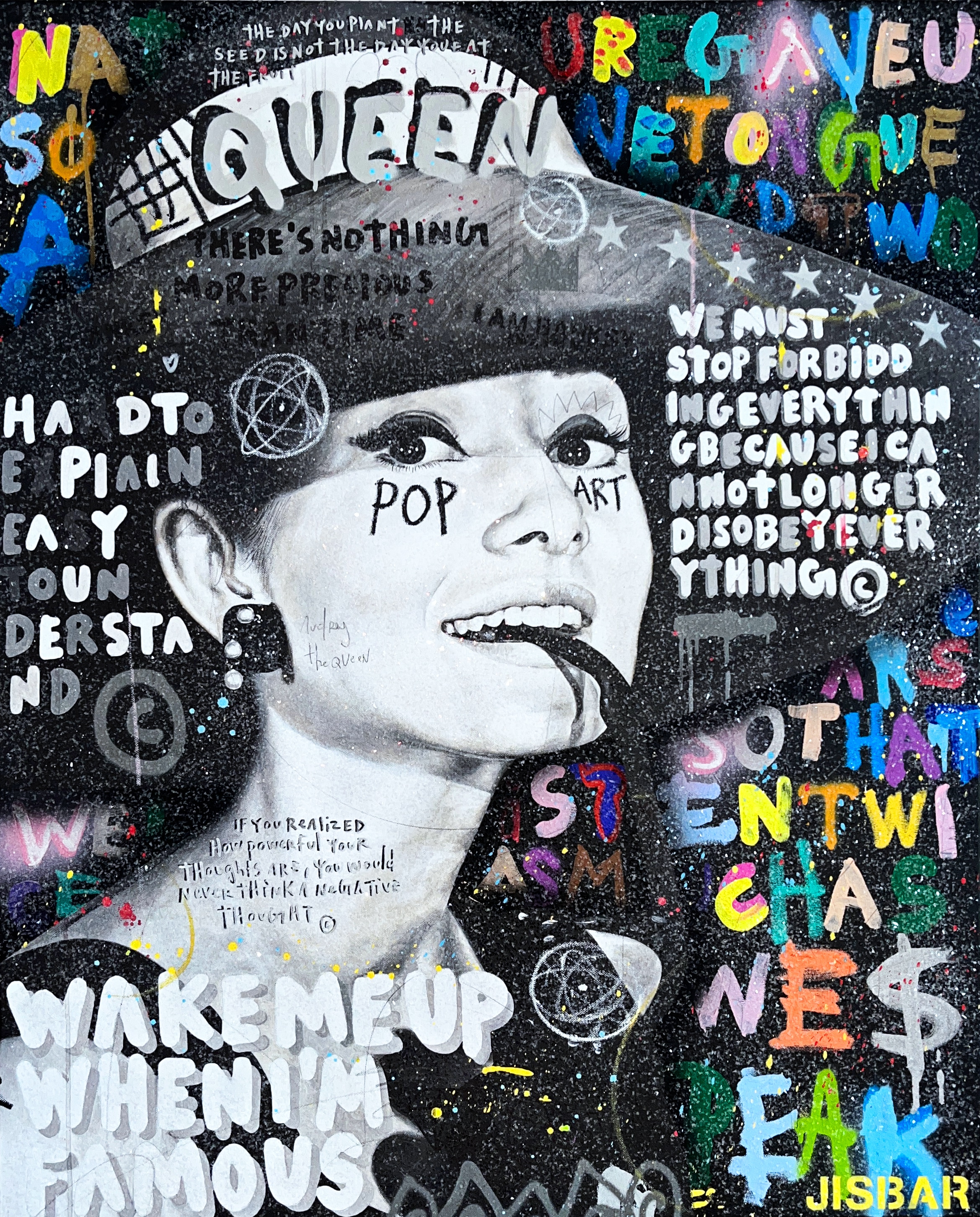 Jisbar se distingue par son interprétation moderne des chefs-d’œuvre classiques, qu’il réinvente avec des éléments graphiques, du collage et des références à la culture pop. Ses œuvres, mélangeant peinture, graffiti et typographie, offrent une vision décalée et dynamique de figures emblématiques telles que Mona Lisa, Frida Kahlo ou encore Van Gogh.